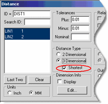 The Shortest check box in the Distance dialog box (Insert | Dimension | Distance), when selected, calculates the true shortest 3D distance between two lines. This check box becomes enabled for selection when you choose 3 Dimensional from the Distance Type area and the input features for the dimension are two lines.