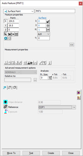For the Eagle Eye 2 measurement, the software hides the Zoom and Gain properties and adds the Exposure and Stripe distance properties. The Scan Feature dialog box settings are the same as the settings described above for the Auto Feature dialog box.