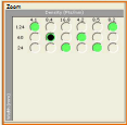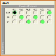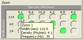 This area displays a grid of option buttons arranged in columns and rows. Across the top, the "columns" show the data density. Along the side, the "rows" list the FOV width. You can only select proper combinations which are the option buttons with a green background. The software grays out the improper combinations.