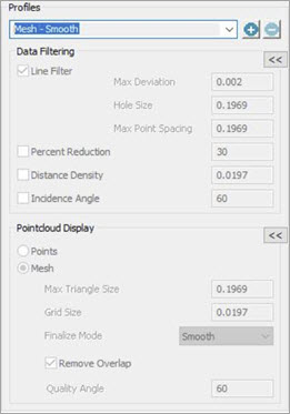 The Profiles section of the Laser Data Collection Settings dialog box (Operation | Pointcloud | Data Collection) allows you to select from a list of pre-configured scan profiles. You can also create your own scan profiles. You must use the Line Filter when scanning with the Mesh display option.