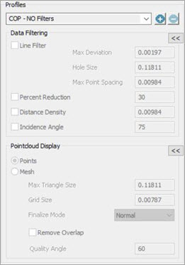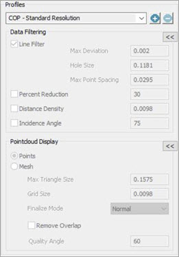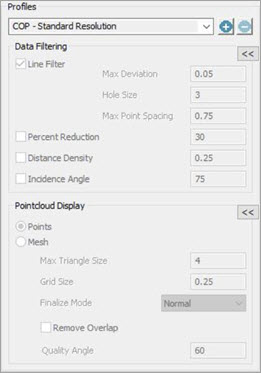 The Profiles section of the Laser Data Collection Settings dialog box (Operation | Pointcloud | Data Collection) allows you to select from a list of pre-configured scan profiles. You can also create your own scan profiles. You must use the Line Filter when scanning with the Mesh display option.