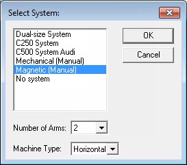 Seleccione el sistema de fixtures flexibles que se va a configurar en el cuadro de lista del cuadro de diálogo Select System. Introduzca el número de brazos en Number of Arms y el tipo de máquina en Machine Type. Debe especificar dos brazos para el modo maestro/esclavo de un sistema de dos brazos. Haga clic en Aceptar para aceptar los cambios realizados. El cuadro de diálogo Fixturing System Setup se abre y muestra los cambios.