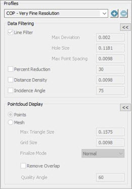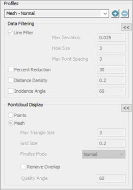 La sección Perfiles del cuadro de diálogo Valores de recopilación de datos de láser (Operación | Nube de puntos | Recopilación de datos) permite seleccionar entre una lista de perfiles de escaneado preconfigurados. También puede crear sus propios perfiles de escaneado. Debe utilizar el Filtro de línea al escanear con la opción Visualización de cuadrícula.