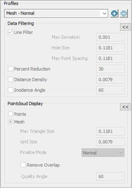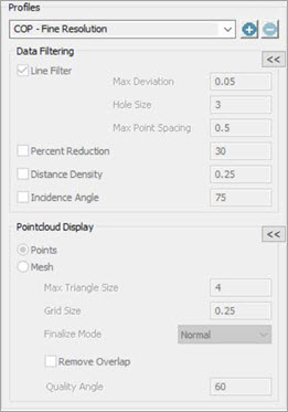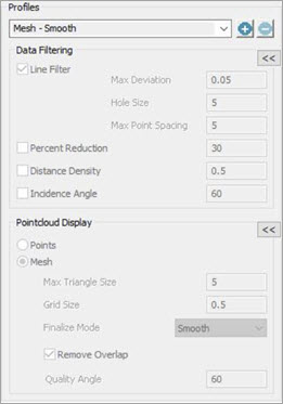 레이저 데이타 수집 설정 대화 상자(작업 | 점구름 | 데이타 수집)의 프로파일 부분은 사전 구성된 스캔 프로파일 목록에서 선택할 수 있게 한다. 자신의 스캔 프로파일을 또한 만들 수 있다. 메쉬 디스플레이 옵션으로 스캔할 때 라인 필터를 사용해야한다.