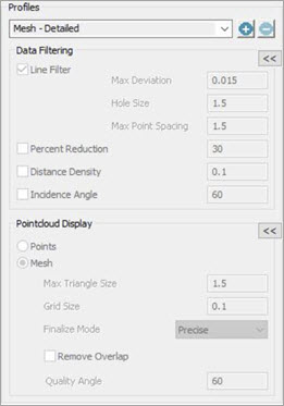 激光数据收集设置对话框(操作 | 点云 | 数据收集)的轮廓部分允许您从预配置的扫描轮廓列表中进行选择。您也可以创建自己的扫描轮廓。通过网格显示选项进行扫描时,必须使用线筛选器。