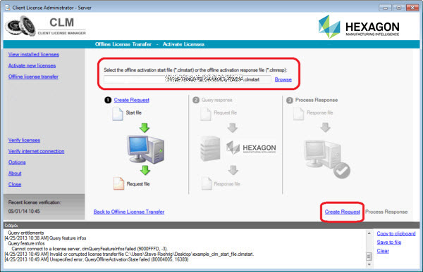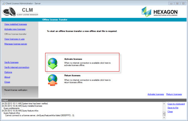 Start the appropriate CLM Administration application described above, and click the Offline license transfer option.