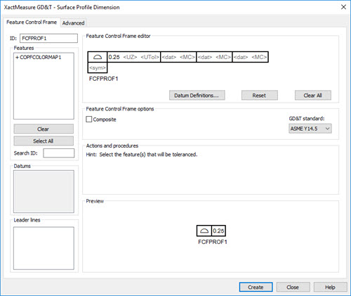 Click the Profile Surface Dimension option from the Dimension toolbar. The software displays the XactMeasure GD&T - Surface Profile Dimension dialog box: