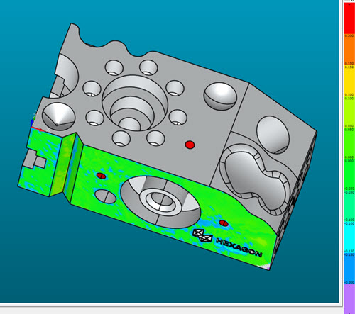 Surface Colormap applied to grouped CAD surfaces (right): The colormap image on the right represents the deviations in each group using the percentage of tolerances.
