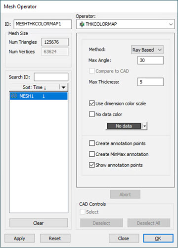When you select the Ray Based method for a Mesh, PC-DMIS pierces the Mesh at each vertex along its normal to the opposing side. The software then uses the data within the Max Angle to calculate the thickness.
