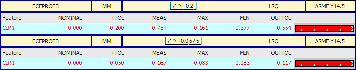 A continuación se muestra un informe de una tolerancia de perfil de una línea unidad. La etiqueta superior corresponde al perfil total de una línea y la etiqueta inferior corresponde al perfil de una línea por unidad.