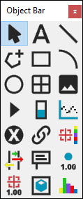La barra de objetos es una barra de herramientas que permite insertar diversos objetos en una plantilla o bien insertar objetos y controles en un formulario. Puede insertar texto, imágenes, material multimedia, controles de cuadro de diálogo, objetos especiales propios de PC-DMIS y otros elementos para crear etiquetas, informes y formularios personalizados.