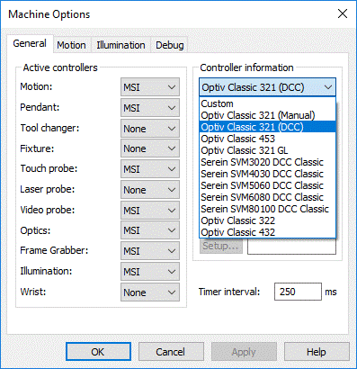 From the Machine Options dialog box (Edit | Preferences | Machine Interface Setup), select the General tab and configure the correct settings in the Active controllers area.
