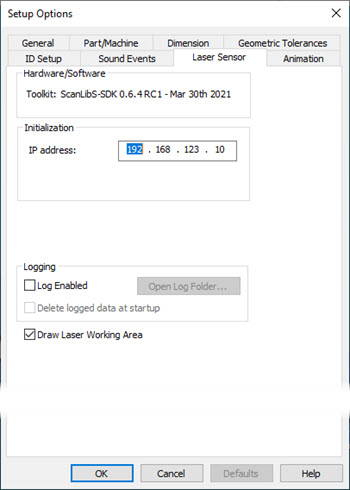 Logging area - You can use this area to generate text-based log files that contain communication results between PC-DMIS and the laser sensor when the measurement routine executes. The information it sends to the log files includes scans, nominals of calculated features, and so on. Hexagon Technical Support can use these files to resolve issues that involve your laser sensor.