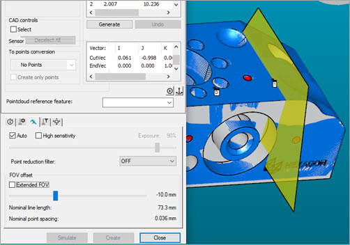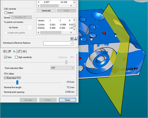 If you select the Draw Laser Working Area check box, the HP-L-10.10 probe parameters draw the trapezoid with the correct dimensions. This functionality helps with simulation in Offline mode. This feature is available for laser Auto features and laser scans.
