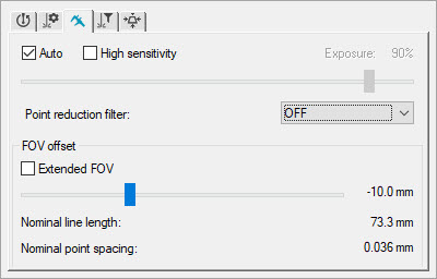 Auto check box and Exposure slider (UD mode) - The HP-L-10.10 sensor offers you two different acquisition modes (Auto and User-defined) to acquire a pointcloud with the highest quality. By default, both modes measure with a frequency of 300 Hz.