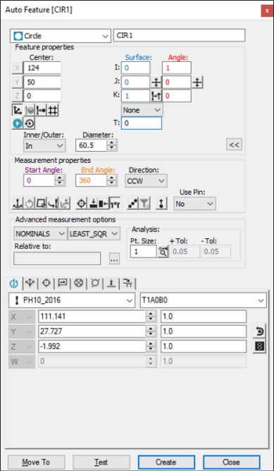 穴(または突起)でさらに3つのヒットを取ります。PC-DMIS は3つのヒットすべてを使用して自動円を計算します。追加のヒットを取ることもできます。PC-DMISは作成ボタンがクリックされるまですべての測定されたヒットからデータを使用します。表示されているX、Y、Zは計算された円(または突起)の中心です。