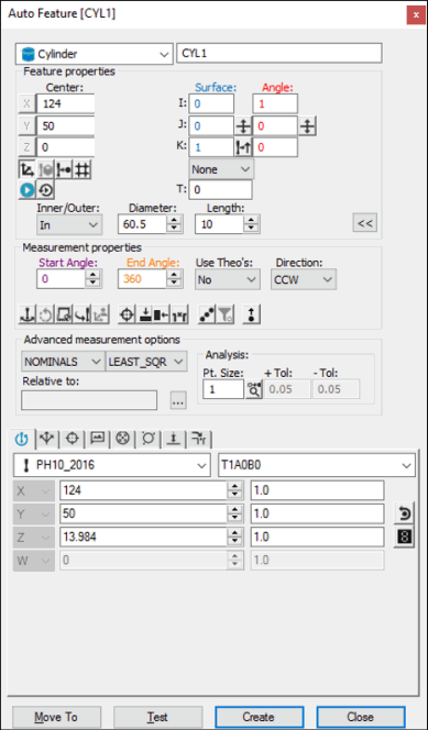 表示されたX、Y、Zの値は、実際のヒットではなく、最も近いCADの円柱を反映しています。I、J、Kは面の法線ベクトルを反映します。CAD円筒が見つからない場合、PC-DMISは最も近い点を表示し、追加のヒットを取るように求めます。