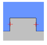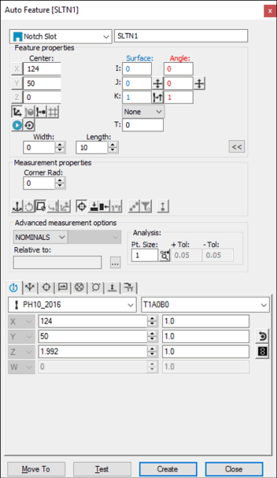 切り欠き自動オプションを利用してノッチの測定を定義することができます。ノッチとは三つ辺を持つ四角形スロットのことです。この種類の測定は、線および円のセットを測定しそれらの交差点および中間点を構築したくない場合に特に便利です。ノッチの測定には4つのヒットが必要です。