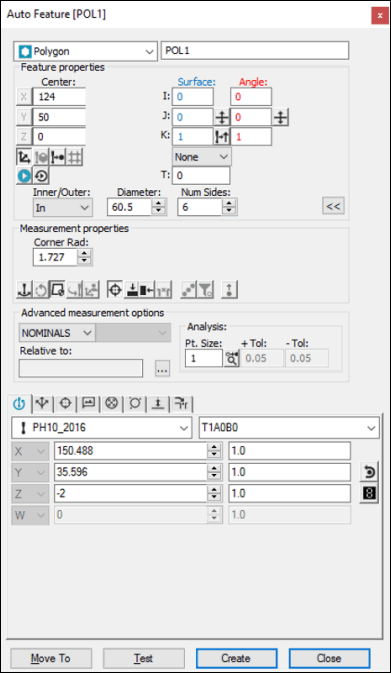多角形の理論的なデータを知っている場合、その理論データを適当なフィールドに入力することで多角形要素の自動作成が可能です。多角形要素の自動作成ダイアログボックスを使用して、XYZ中心点およびIJKベクトルを指定します。辺の数、辺ごとのヒット数、直径、およびコーナー半径を定義します。終了したら、作成をクリックします。