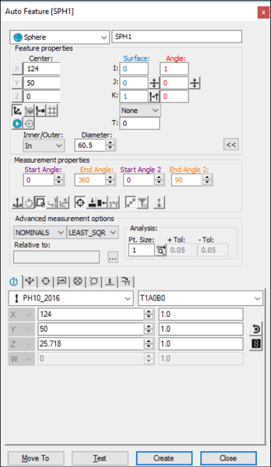 球の板金オプションでは、球の測定を定義できます。この種類の測定は、どの作業平面とも平行でない平面に球が存在する場合に特に有効です。自動球の測定には最低4つのヒットを必要とします。