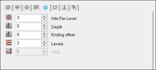 3番目のヒットは最初のヒットから180度回転し、深さ(深さ – ((ヒット数-1)/総ヒット数 * ピッチ間隔))の位置にあります。