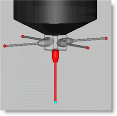 グラフィック表示ウィンドウの強調表示されたプローブチップは、どのチップがアクティブであるかを示します。PC-DMISは、複数のプローブシャンクを持つプローブ上のアクティブプローブチップを強調表示できます。PC-DMISは、そのプローブチップを使用するコマンドをクリックするとその先端を強調表示します。