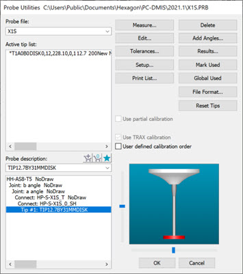 プローブを定義する際に、球スタイラスではなく、ディスクスタイラスのモデルを構築することを確認します。測定プローブ上で測定ボタンをクリックすると、PC-DMISはディスクスタイラスを持ったアナログプローブが処理を実行すると自動的に認識します。