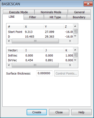 線に沿って表面を走査するには、挿入|スキャン|線を選択します。BASICSCANダイアログボックスのLINE タブが表示されます: