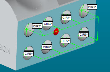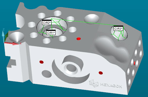 さらに、QuickFeaturesを使用した要素のパターンの場合、PC-DMISはパターン内の要素間にパス線を描画します。