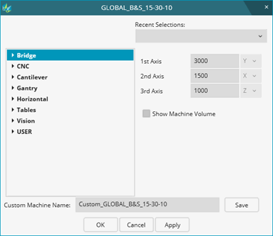 仮想機械全体を表示せずに、仮想テーブル (または、CMMベースプレート) のみを表示したい場合があります。これを行うには、機械の一覧のテーブルカテゴリからオプションを選択します。