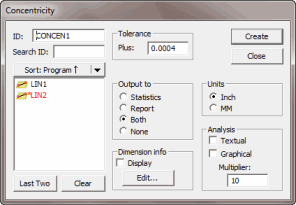 挿入 | 次元 | 同心度 メニューオプションは2つの円または円柱、円錐、球の同心度を計算します。入力される2番目の要素は常にデータ要素であり、軸を表す線要素である場合もあります。1つの要素だけが選択される場合、現在の作業平面はデータ要素になります。この測定結果の型は片側で考慮され、1つの正の値の公差が適用されます。