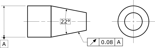 この幾何公差は、円錐形の要素からのデータを複数の断面に分割します。公差値は、各断面の振れを評価します。各公差ゾーンを公称面に垂直に向けます。実際の断面が最悪となる可能性を最小化するために、多くの断面で円錐を測定することを推奨します。