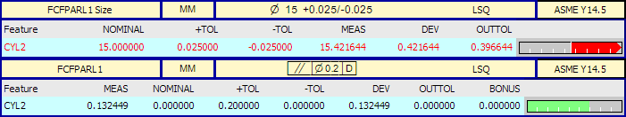 以下は、平行度の公差のレポート例です。円柱の寸法公差は上のラベルにあり、直径ゾーンの平行度は下のラベルにあります。