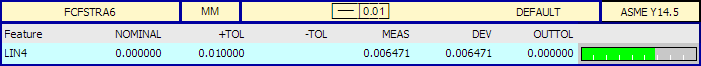 単位あたりのチェックボックスをオンにすると、真直度には2つのセグメントがあります。最初の(上部の)セグメントは、上記の全体的な真直度です。下のセグメントは、単位長さを定義する単位ごとの真直度です。単位ごとの公差は、公差付き要素のすべての可能な単位がどれだけ直線的かを制御します。