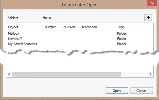 PC-DMISがTeamcenterへの接続を確立したら、固有のTeamcenter Openダイアログボックスが開きます。このダイアログボックスを使用すると、Teamcenterデータベース内で移動できます。それはデータベースに保存されたフォルダおよびファイルを表示します。