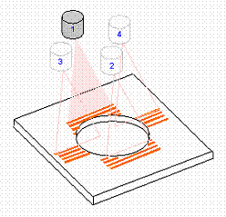 PC-DMIS では円に対して異なる2種類のパスが提供されます。レーザーストライプの利用可能な部分の直径とサイズに基づいて適切なパスが自動的に選択されます。自動円に対しては、PC-DMIS は常にストライプの方向に垂直なスキャンを行います。