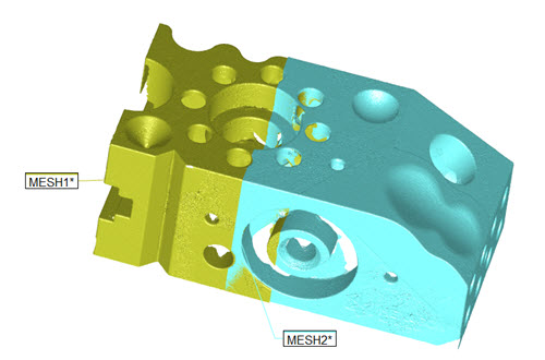 メッシュ間の整列機能では、重複を持つ2つの異なる参照フレームで収集されたあるメッシュを別のメッシュに最適に整列することができます。典型例は2つの点群コマンドにおける2つのスキャンであり、同じパート方向でスキャンできないパートの領域を表します。