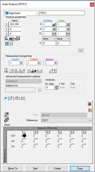 プローブツールボックスの接触経路のプロパティタブから、深さ、インデント、および間隔の値を指定します。PC-DMIS はグラフィックの表示ウィンドウで変更内容に対応したグラフィカルな可視化を示します。