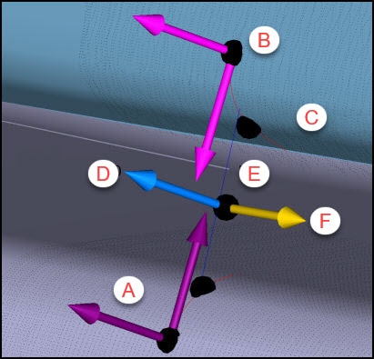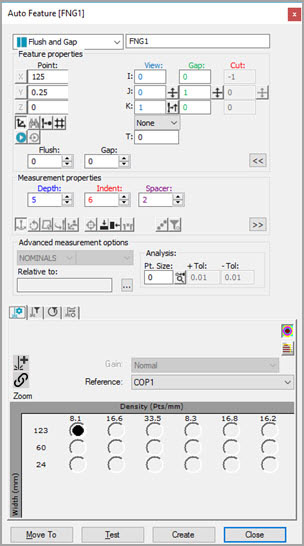 レーザーセンサを使用してフラッシュとギャップを測定するには、[要素の自動作成] ダイアログボックスにアクセスし、フラッシュとギャップを選択します。ダイアログボックスは[拡張板金オプション]エリアを自動的に拡張します。このエリアでは、マスターおよびゲージ側の点のために XYZ位置ボックスとIJKベクトルボックスが用意されています。以下の手順のうちの1つに従います。