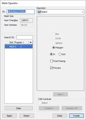 MESHSELECTION1=MESH/OPER,SELECT,POLYGON,INSIDE=YES,FRONT_FACING=YES,0,