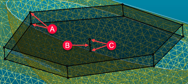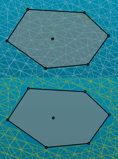 PC-DMISには、[イン]オプションを選択した時に、ポリゴンの選択範囲内にある三角形のサブセットのみが含まれます。