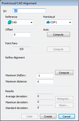 最大標準偏差-このボックスは、自動アライメントの実行中にPC-DMISが使用する最大標準偏差を定義します。コマンドの実行中にPC-DMISが入力された値を超えると、ソフトウェアはCAD/ポイントクラウドで点ペアを選択するように請求します。値を -1 にすると最大StdDev機能は無効になります。