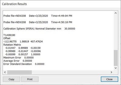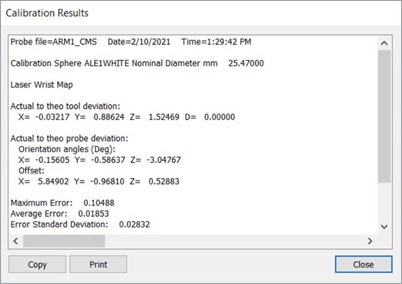 PC-DMIS はこのダイアログボックスにおいて校正から得られる実績を記録します。最大、平均、および標準偏差の値を確認します。