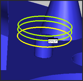 ポータブル円筒および円錐 (また要素抽出のみの要素)は境界を(開始点と終了点から垂直クリップを引いた値)ライムグリーンで描画します。例として、以下のポータブル円筒の図を参照してください。
