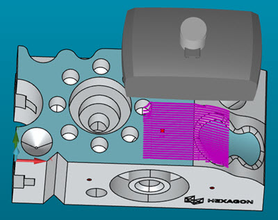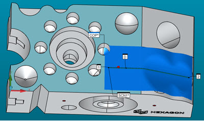 レーザー・プローブの向き、視野、スキャン設定を使用して、このソフトウエアはレーザーラインをCADモデルに投影します。この方法で、シミュレーションされたポイントクラウドが許容可能かどうかを確認し、必要に応じて個々のスキャンを変更することができます。PC-DMISはシミュレーションされた点をCOP内に保持します。