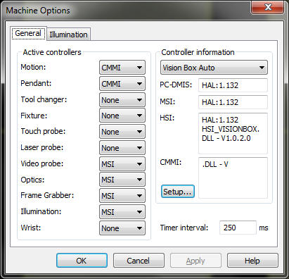 When you first start PC-DMIS after you install it, you should run it with administrator privileges. This ensures that the software properly initializes the entries and the correct settings for the active controllers in the Machine Options dialog box (Edit | Preferences | Machine Interface Setup):