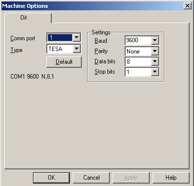 The Oit tab allows you to configure the serial connection that connects to your OIT device. You can choose your communications port (COM port) and modify your COM port settings. For information on your COM port settings, check the documentation that came with your controller. The available OIT types are TESA, VORNE, or GE.