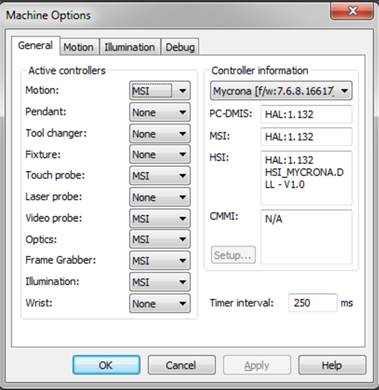 Please note, if you need to configure the machine with a laser probe, the Laser probe setting in the Active controllers area of the Machine Options dialog box should be set to MSI.
