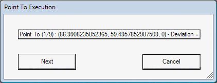 ダイアログボックスには次へボタンと取り消しボタンがあります。これらのボタンを使用すると、リストの次のポイントに循環して切り替わるタイミングをコントロールできます。デバイスは一番目の点に移動してレーザーをオンにしてから、オペレータが次へボタンをクリックするまで待機します。次に、デバイスはリストの次の点に移動します。