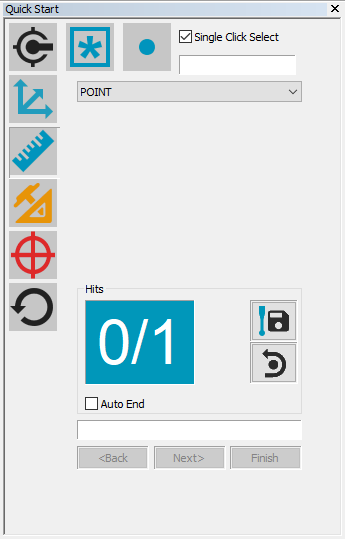 詳しくは、PC-DMIS Coreドキュメントのその他のウィンドウ、エディタおよびツールの使用」章にある「クイックスタートインターフェースの使用」を参照して下さい。